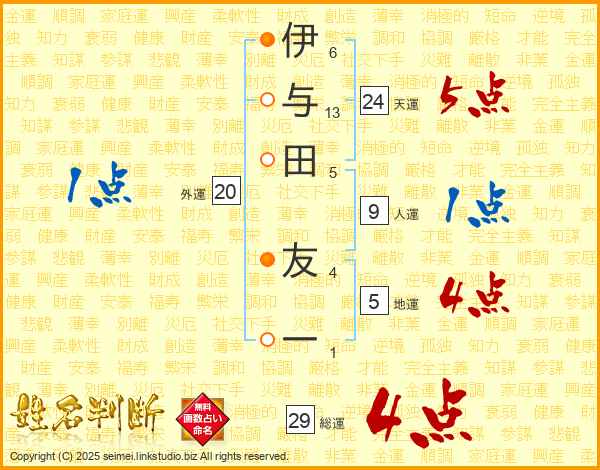 伊(6画)与(13画)田(5画) 友(4画)一(1画)
