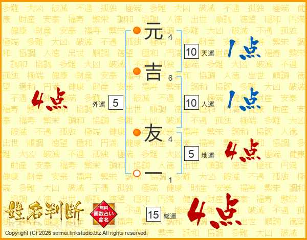 元(4画)吉(6画) 友(4画)一(1画)