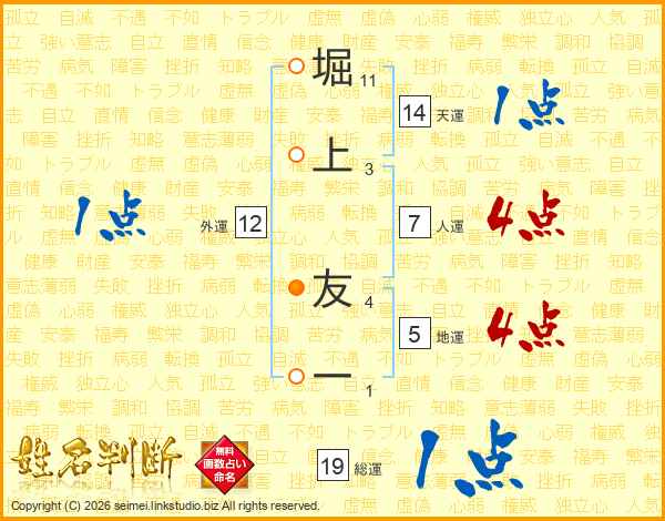 堀(11画)上(3画) 友(4画)一(1画)