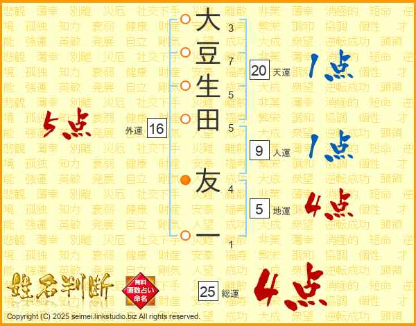 生活面を象徴する運勢です。外部から受ける影響力を表し、結婚運、家庭運や職場、環境への順応性を表します。総運から人運を引いた画数。姓や名が1文字の場合を除く。