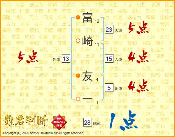 生活面を象徴する運勢です。外部から受ける影響力を表し、結婚運、家庭運や職場、環境への順応性を表します。総運から人運を引いた画数。姓や名が1文字の場合を除く。