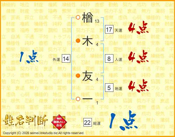 生活面を象徴する運勢です。外部から受ける影響力を表し、結婚運、家庭運や職場、環境への順応性を表します。総運から人運を引いた画数。姓や名が1文字の場合を除く。