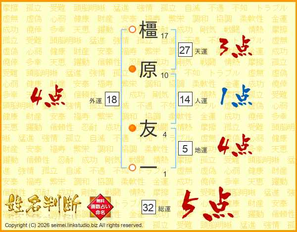 橿原友一さんの総運は32画の5点!