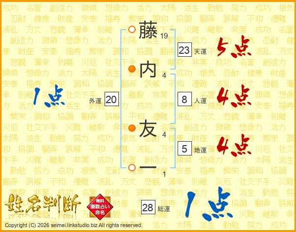 生活面を象徴する運勢です。外部から受ける影響力を表し、結婚運、家庭運や職場、環境への順応性を表します。総運から人運を引いた画数。姓や名が1文字の場合を除く。