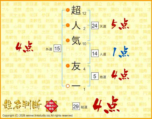 超人気友一さんの総運は29画の4点!