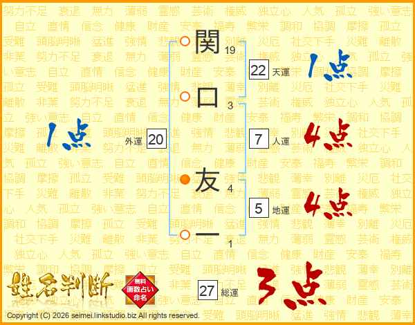 生活面を象徴する運勢です。外部から受ける影響力を表し、結婚運、家庭運や職場、環境への順応性を表します。総運から人運を引いた画数。姓や名が1文字の場合を除く。