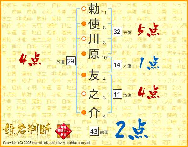 勅(11画)使(8画)川(3画)原(10画) 友(4画)之(3画)介(4画)