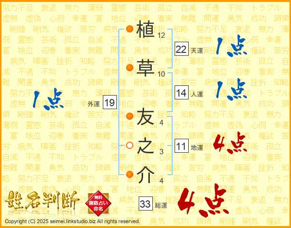 生活面を象徴する運勢です。外部から受ける影響力を表し、結婚運、家庭運や職場、環境への順応性を表します。総運から人運を引いた画数。姓や名が1文字の場合を除く。