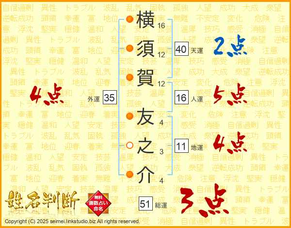 横(16画)須(12画)賀(12画) 友(4画)之(3画)介(4画)