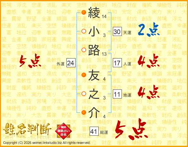 綾小路友之介さんの総運は41画の5点!