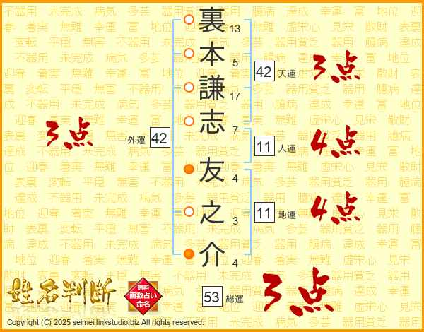 裏(13画)本(5画)謙(17画)志(7画) 友(4画)之(3画)介(4画)