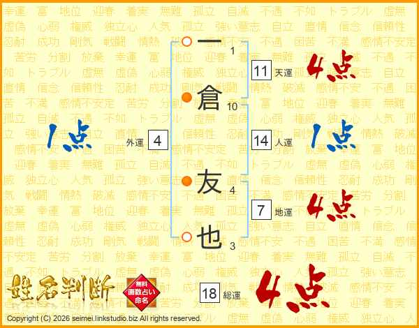 生活面を象徴する運勢です。外部から受ける影響力を表し、結婚運、家庭運や職場、環境への順応性を表します。総運から人運を引いた画数。姓や名が1文字の場合を除く。