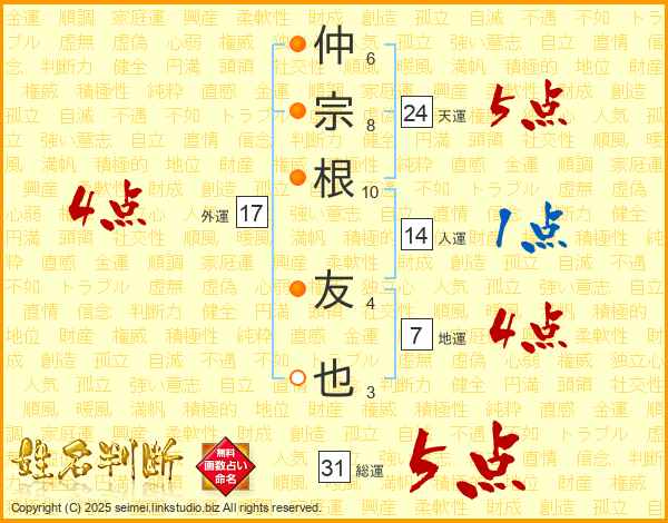仲(6画)宗(8画)根(10画) 友(4画)也(3画)