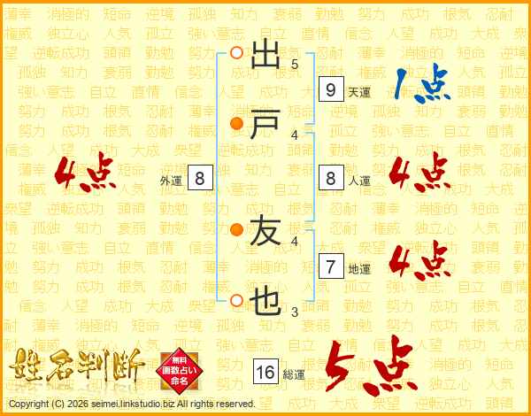 出戸友也さんの総運は16画の5点!