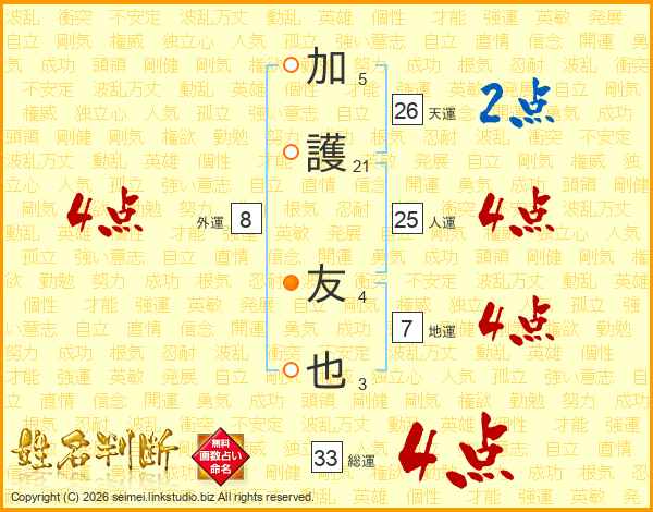 加護友也さんの総運は33画の4点!