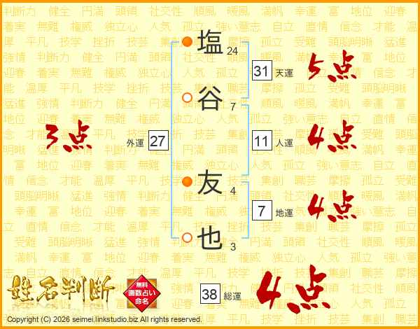 塩谷友也さんの総運は38画の4点!