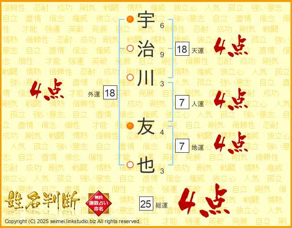 宇(6画)治(9画)川(3画) 友(4画)也(3画)