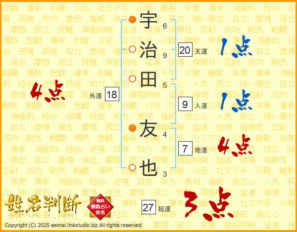 宇(6画)治(9画)田(5画) 友(4画)也(3画)
