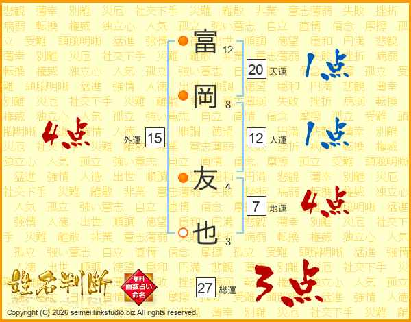 生活面を象徴する運勢です。外部から受ける影響力を表し、結婚運、家庭運や職場、環境への順応性を表します。総運から人運を引いた画数。姓や名が1文字の場合を除く。
