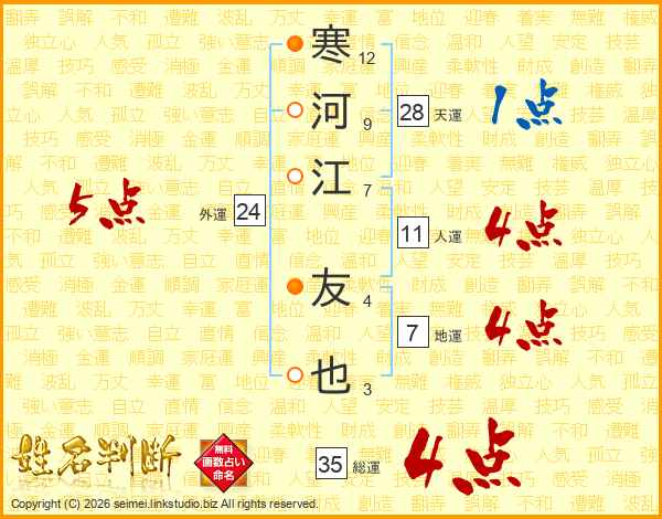 寒河江友也さんの総運は35画の4点!