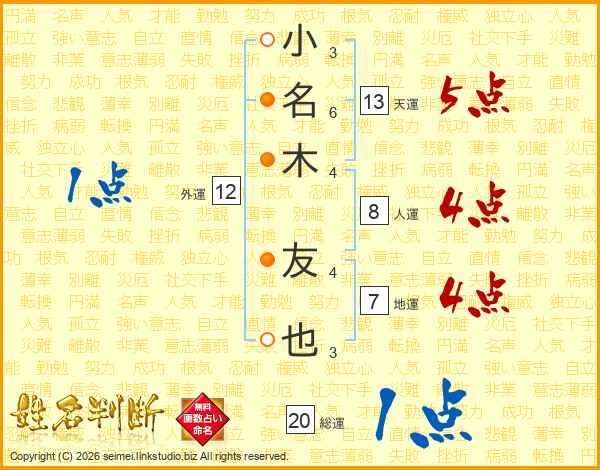 小(3画)名(6画)木(4画) 友(4画)也(3画)