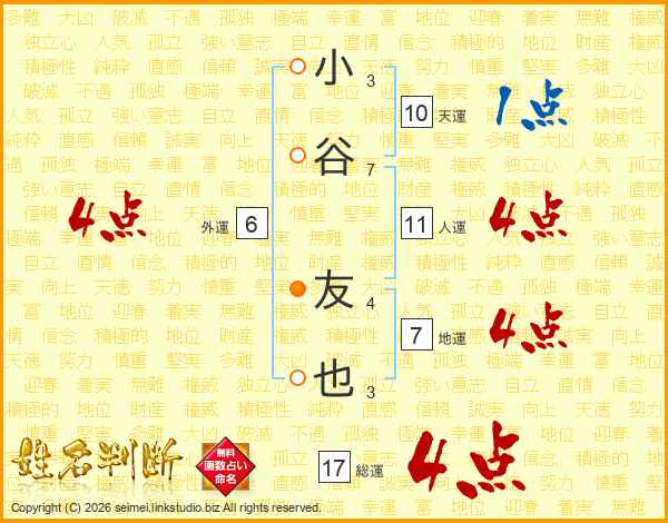 生活面を象徴する運勢です。外部から受ける影響力を表し、結婚運、家庭運や職場、環境への順応性を表します。総運から人運を引いた画数。姓や名が1文字の場合を除く。