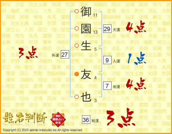 御(11画)園(13画)生(5画) 友(4画)也(3画)