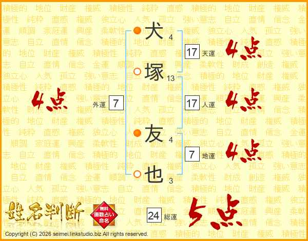 あなたの人生を表す1番重要な運勢です。生涯を通じて影響する総合運となり、主に50歳以降の晩年期に影響を及ぼします。苗字と名前の合計画数。