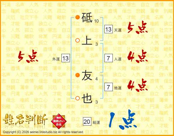 砥上友也さんの外運は13画の5点!