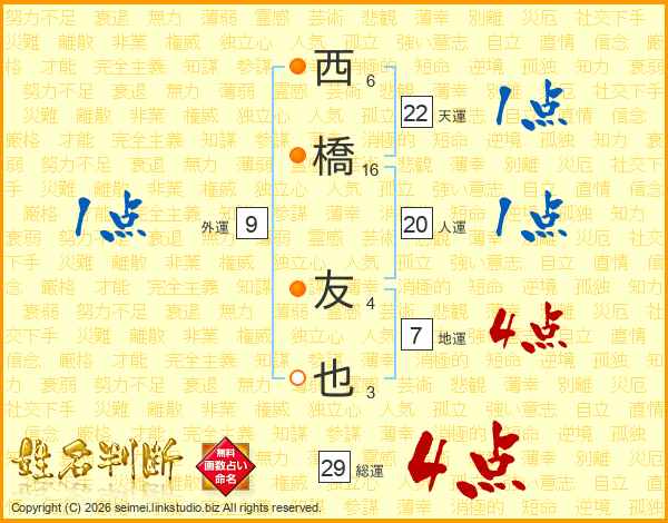 西橋友也さんの総運は29画の4点!