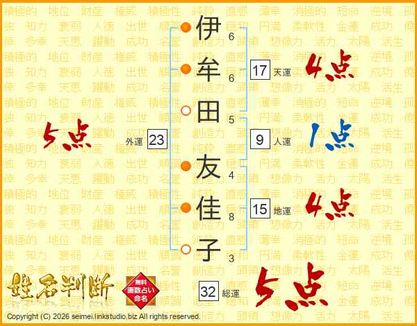 伊(6画)牟(6画)田(5画) 友(4画)佳(8画)子(3画)