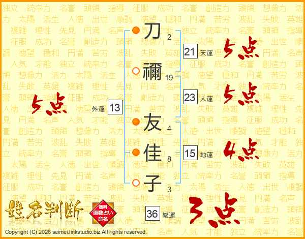 刀(2画)禰(19画) 友(4画)佳(8画)子(3画)