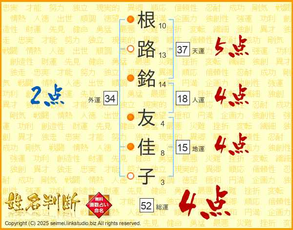 根(10画)路(13画)銘(14画) 友(4画)佳(8画)子(3画)