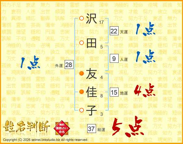 沢(17画)田(5画) 友(4画)佳(8画)子(3画)