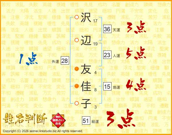 沢(17画)辺(19画) 友(4画)佳(8画)子(3画)
