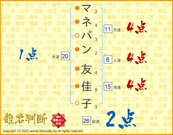マネパン友佳子さんの総運は26画の2点!