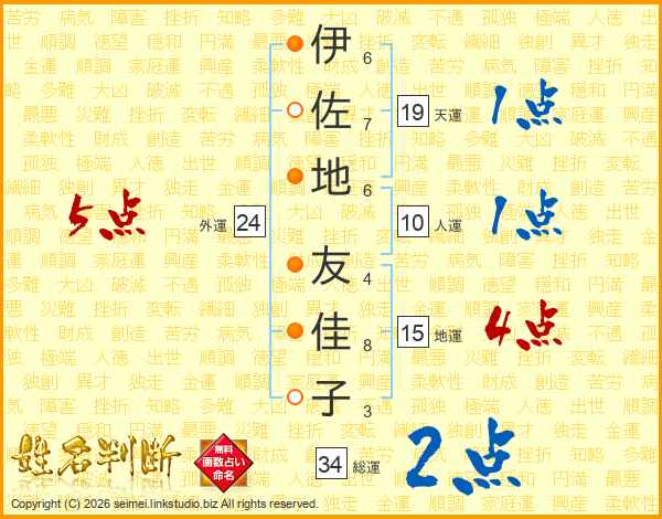 伊(6画)佐(7画)地(6画) 友(4画)佳(8画)子(3画)