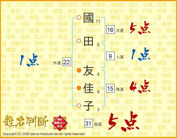 國(11画)田(5画) 友(4画)佳(8画)子(3画)