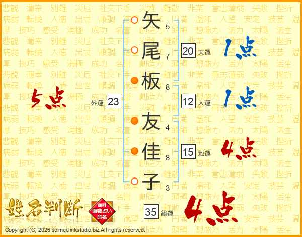 矢尾板友佳子さんの総運は35画の4点!
