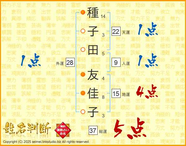 種(14画)子(3画)田(5画) 友(4画)佳(8画)子(3画)