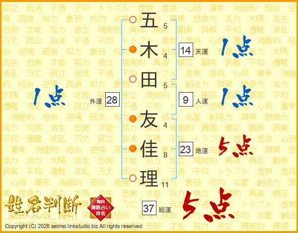五木田友佳理さんの総運は37画の5点!