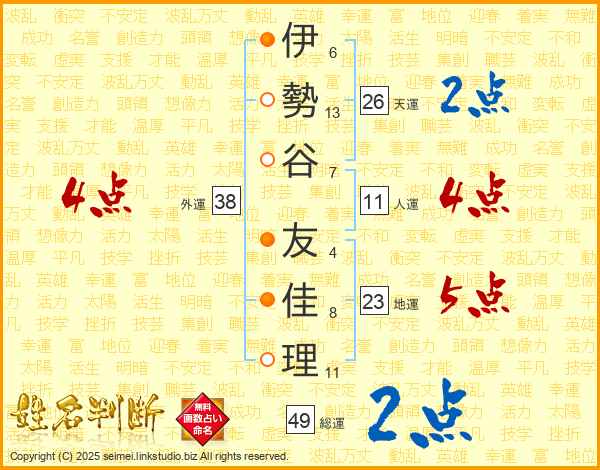 伊(6画)勢(13画)谷(7画) 友(4画)佳(8画)理(11画)