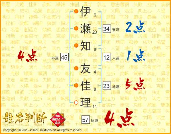 伊瀬知友佳理さんの外運は45画の4点!