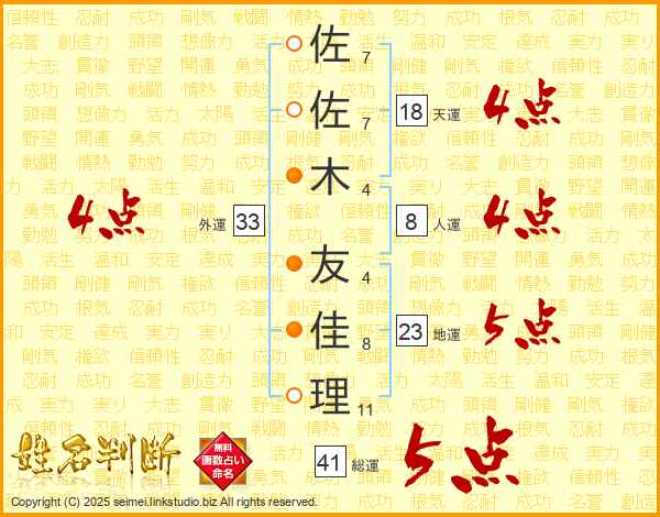 佐(7画)佐(7画)木(4画) 友(4画)佳(8画)理(11画)