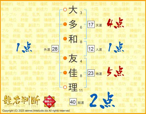 生活面を象徴する運勢です。外部から受ける影響力を表し、結婚運、家庭運や職場、環境への順応性を表します。総運から人運を引いた画数。姓や名が1文字の場合を除く。
