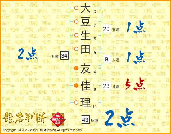 大(3画)豆(7画)生(5画)田(5画) 友(4画)佳(8画)理(11画)