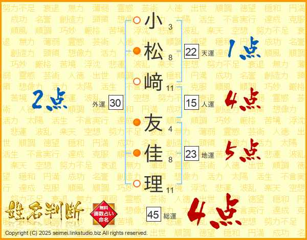 小(3画)松(8画)﨑(11画) 友(4画)佳(8画)理(11画)