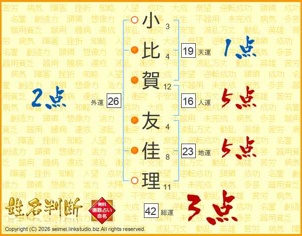 小(3画)比(4画)賀(12画) 友(4画)佳(8画)理(11画)