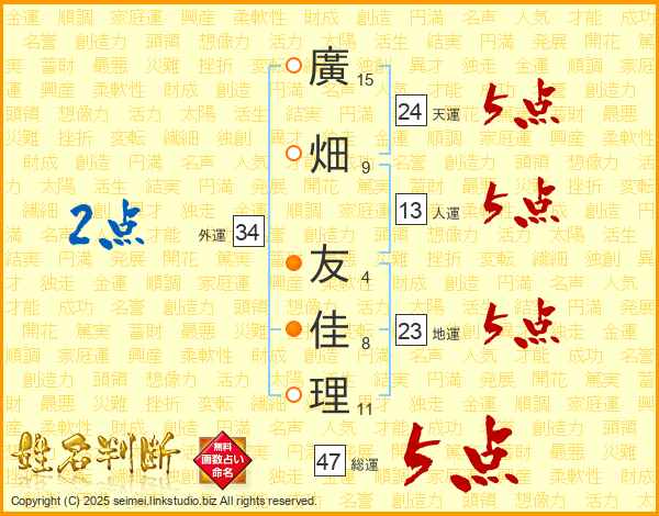 廣(15画)畑(9画) 友(4画)佳(8画)理(11画)