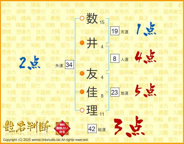 数(15画)井(4画) 友(4画)佳(8画)理(11画)